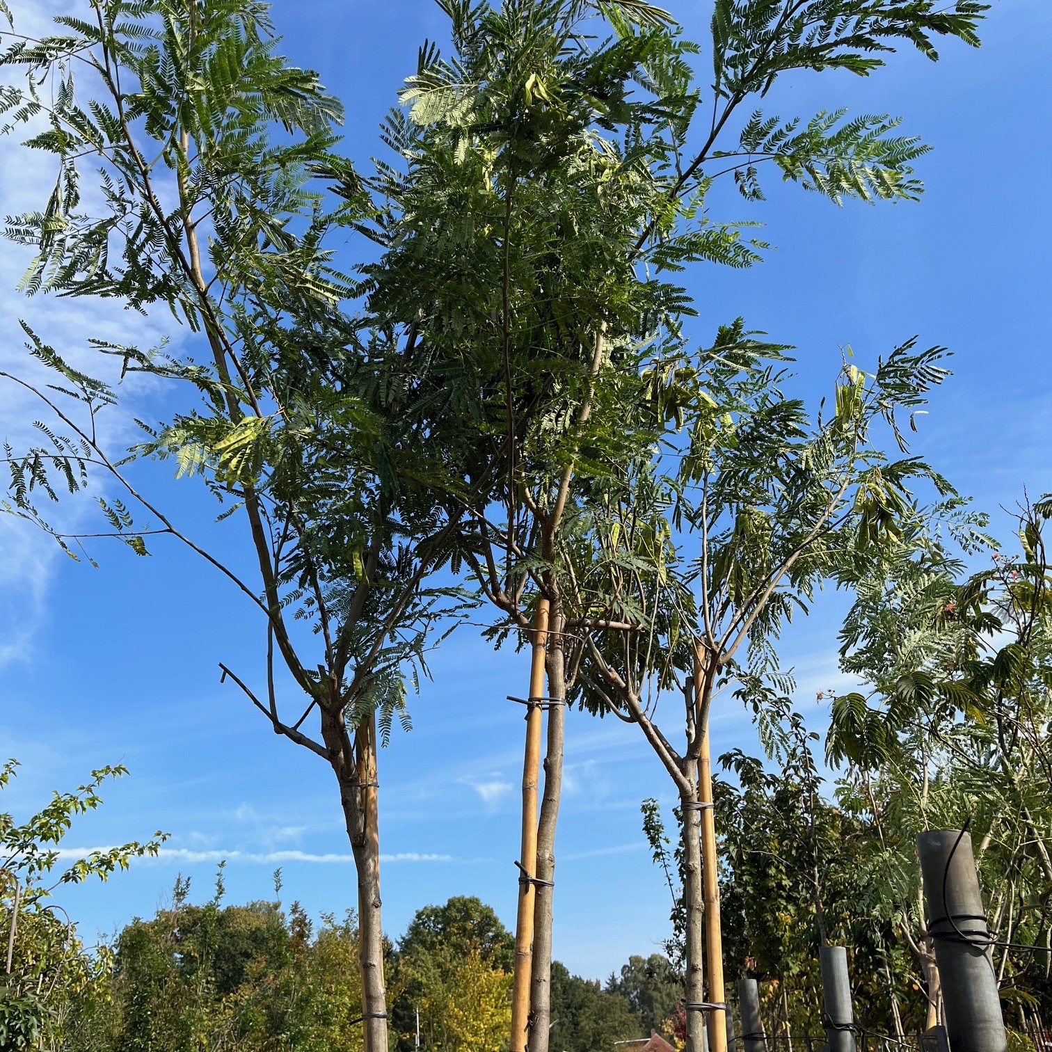 Een ietwat tropisch aandoende, kleine boom met de typische parapluvormige kruin. De bladeren zijn prachtig gevederd. Het blad sluit zich bij avond. In juli-oktober verschijnen meestal in warme zomers grote lichtroze bloembundels met lange, zijdezachte meeldraden.