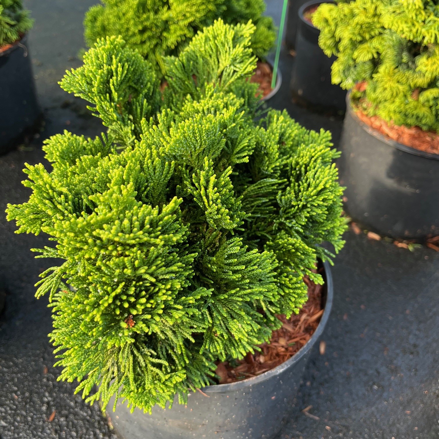 Een aantrekkelijke semi-dwergvorm met heldergroen, dik loof dat in de winter bronsachtig verkleurt. De twijgjes zijn licht gedraaid. Een gedrongen, ietwat kegelvormige groeiwijze.