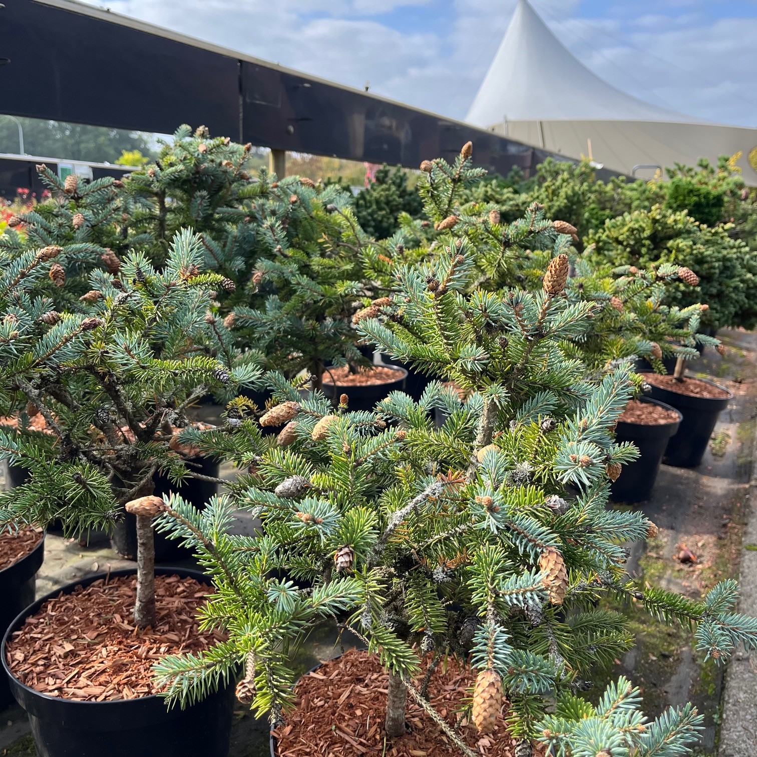 Een aantal dennen en coniferen op stam van traaggroeiende en laagblijvende soorten. Geschikt voor de kleine tuin en als solitair. Wintergroen.