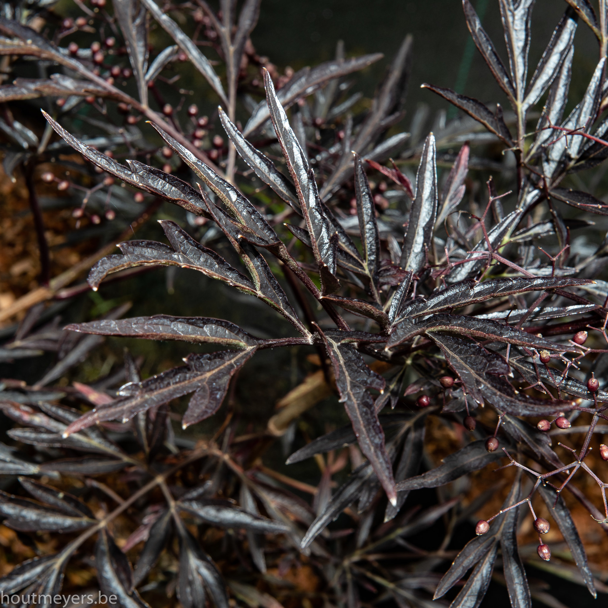 Een schitterende vlierbes tot 4 meter hoog met de typische opvallende, diep purperrode, geveerde bladeren! Een prachtige solitair. Lichtroze bloemschermen kleuren de plant in mei-juni. Eetbare bessen.