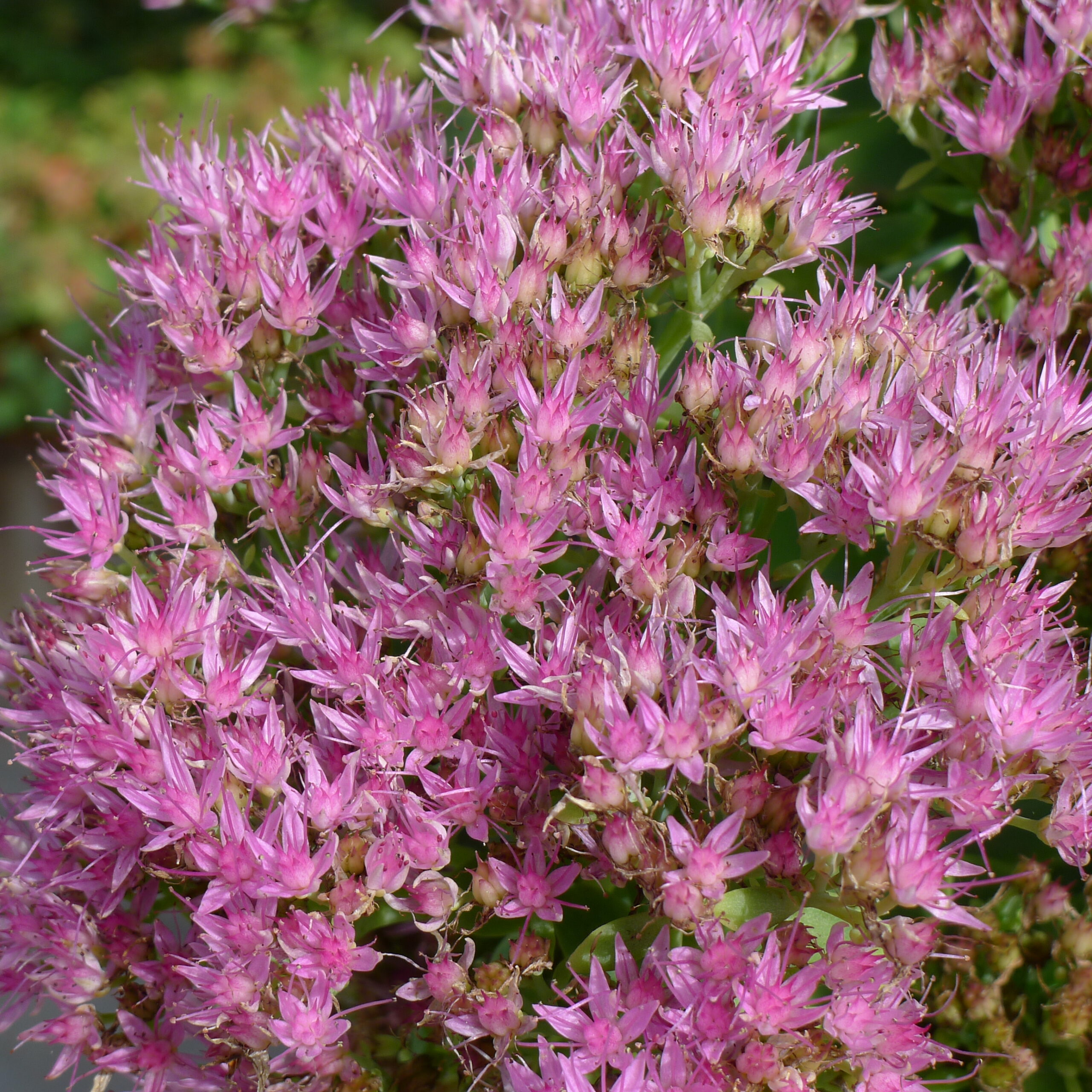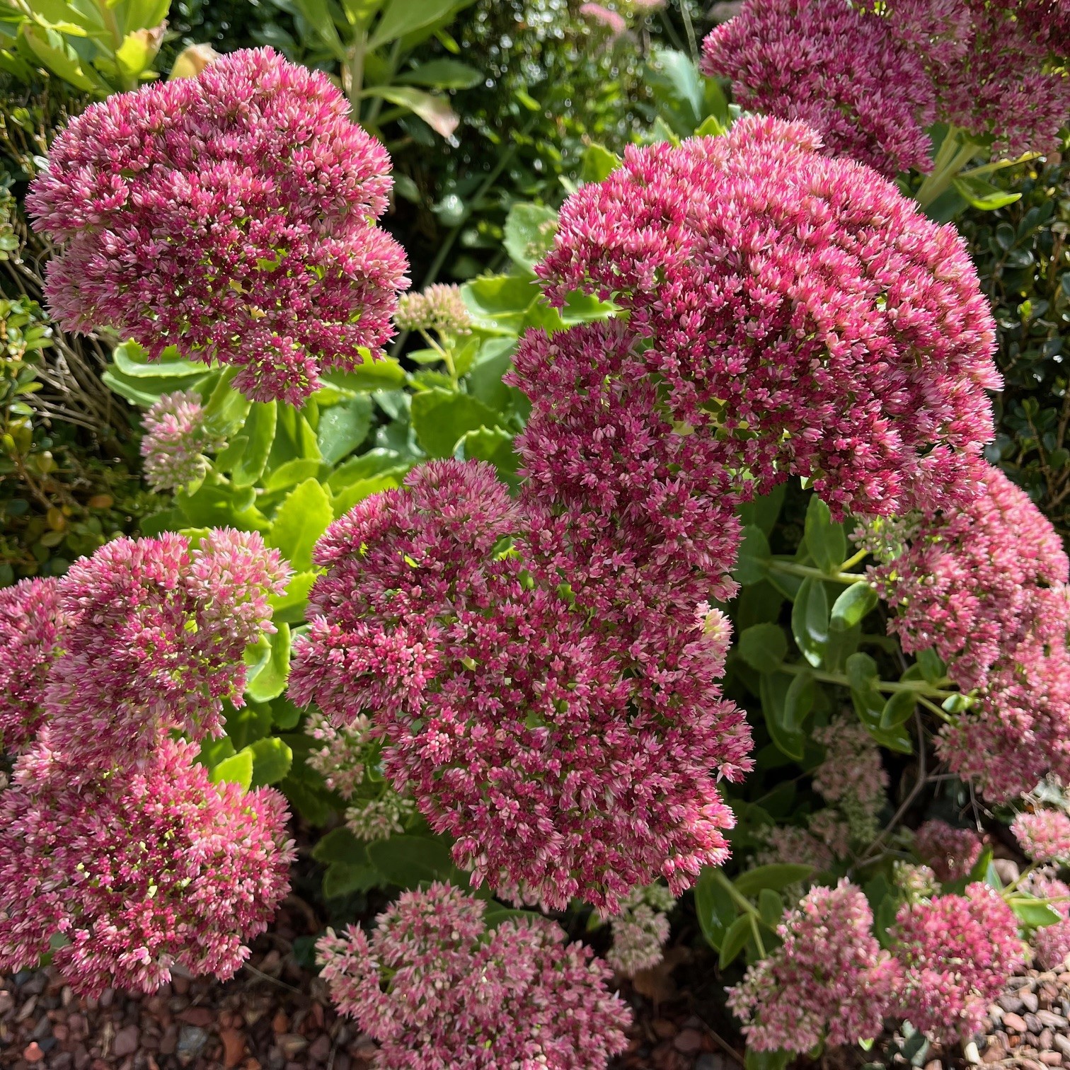 Een vaste plant met groengrijze, leerachtige, dikke, ovale bladeren en prachtige vlakke schermen van purperrode bloemen van augustus tot oktober. Deze soort bereikt een hoogte van 50 cm. Niet wintergroen, maar wel een mooi wintersilhouet.